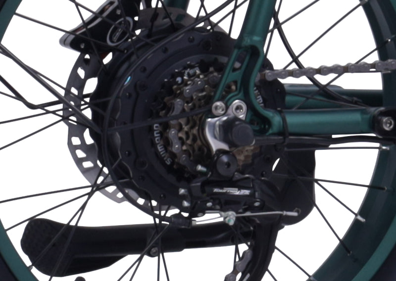The Shimano 7-speed gear system allows for smooth shifting between different gear ratios, giving you flexibility for various terrains. The derailleur system ensures precise gear changes, providing a comfortable riding experience whether you're climbing hills, cruising on flat roads, or navigating tough trails. The wide range of gear options ensures that you can adjust the bike's performance to match your riding conditions.