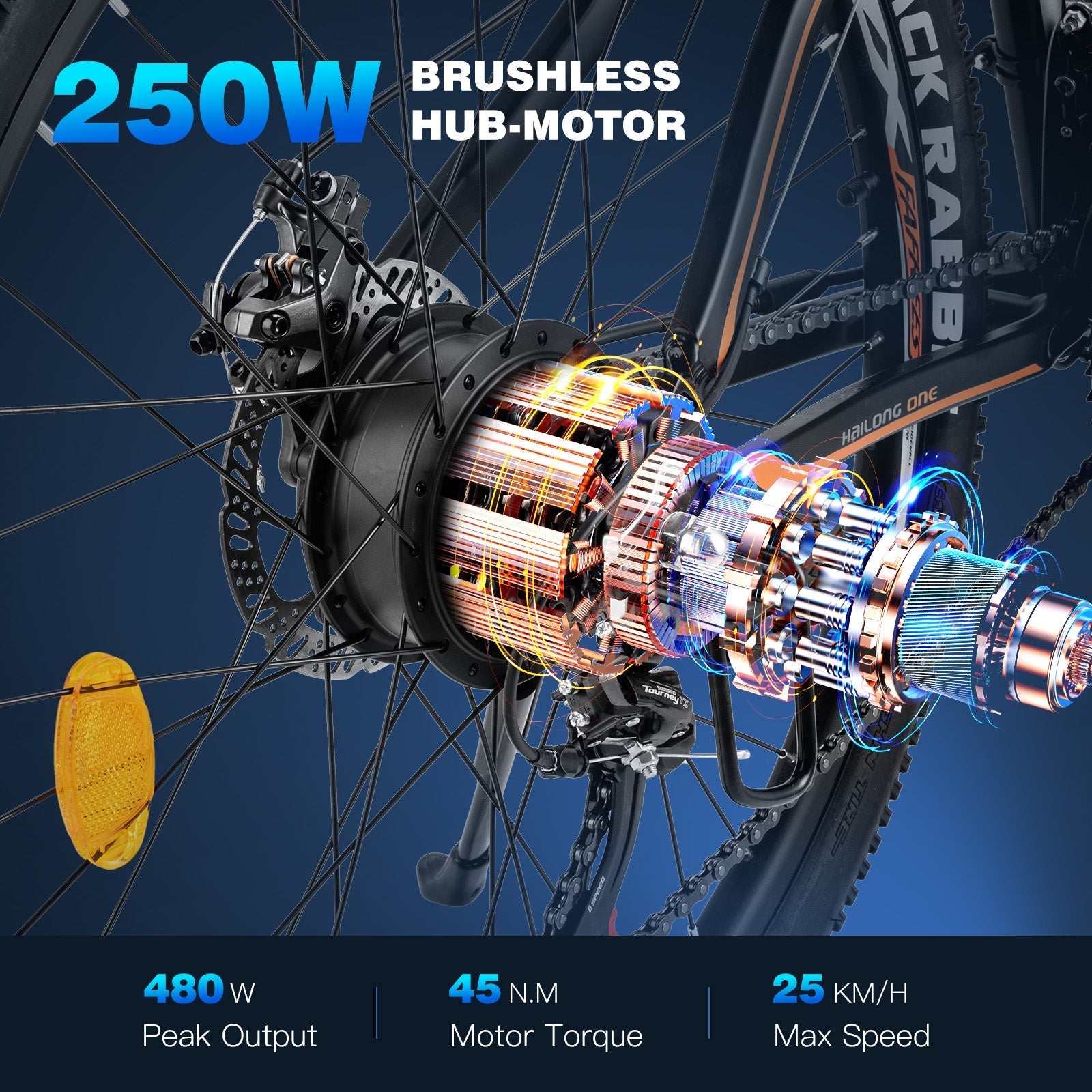 Experience the exceptional 250W hub motor with a peak output of 450W and 45N.m of maximum torque. Whether you're conquering rugged trails, cruising through your daily commute, or seeking adventure in the great outdoors, this Fafrees 26 Hailong One Electric Bike motor is your reliable and powerful companion.